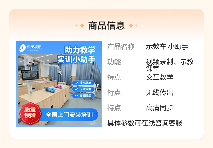 靈活移動(dòng)設(shè)計(jì),適合多場(chǎng)景切換,支持教室、實(shí)驗(yàn)室和臨時(shí)培訓(xùn)環(huán)境。 集成高清視頻采集模塊,支持在線直播和錄制,方便遠(yuǎn)程教學(xué)與資源共享。 內(nèi)置示教小助手系統(tǒng),輔助教師快速管理教學(xué)內(nèi)容,實(shí)現(xiàn)課件與實(shí)驗(yàn)操作無(wú)縫同步。 國(guó)產(chǎn)自主研發(fā),保障產(chǎn)品穩(wěn)定性與售后服務(wù)的及時(shí)響應(yīng)。 自動(dòng)化示教技術(shù),實(shí)現(xiàn)多角度、多畫(huà)面的自動(dòng)切換,提升觀課體驗(yàn)。三、視頻教學(xué)與在線直播的結(jié)合